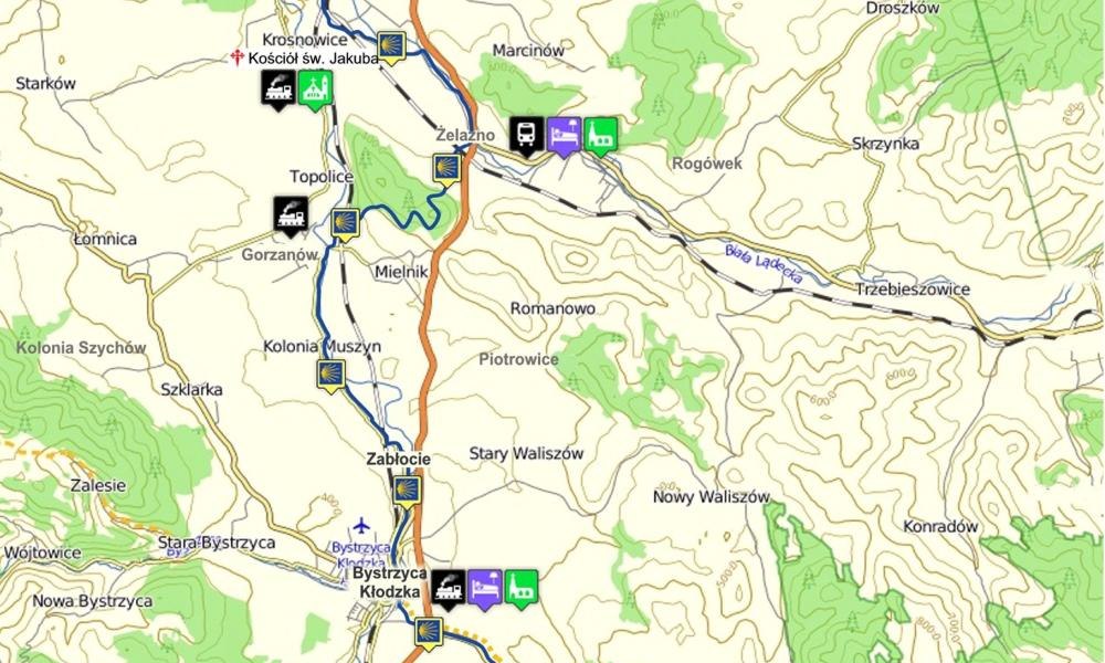 Sudecka droga św. Jakuba. Szlak oznakowany żółtą muszlą na niebieskim tle prowadzi z Międzygórza poprzez Górę Igliczną, Marianówkę, Idzików do Bystrzycy Kłodzkiej, dalej przez Bystrzycę w stronę Zabłocia doprowadzając do Gorzanowa. Wytyczony szlak stanowi przedłużenie Sudeckiej Drogi św. Jakuba, który przebiega od Krzeszowa przez Jelenią Górę do Lubania, a następnie przez Niemcy lub Czechy i Francję prowadzi do Santiago de Compostela w Hiszpanii.