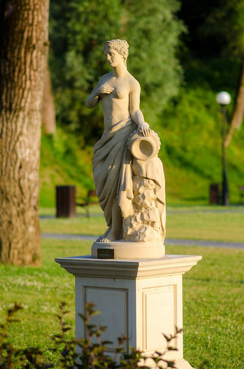 Ogród Tematyczny również nazywany Ogrodem Miłości do złudzenia przypominają ogrody greckie lub rzymskie. Wchodząc do niego, można poczuć się niczym antyczny Perseusz wkraczający do ogrodu Meduzy pełnego ludzkich posągów. Na powierzchni ponad 7 ha usytuowane są figur z piaskowca przedstawiających muzy, bogów greckich, a także pory roku. Wśród nich szczególnie interesująca jest rzeźba jesieni, do złudzenia przypominająca Dionizosa – boga wina, dobrej zabawy i atrakcji (których w Muszynie nie brakuje). Pośród urokliwych alejek spacerowych górują na piedestałach posągi Adonisa – ukochanego Afrodyty, bóstw umierania i odradzania się przyrody; Hebe – żony Herkulesa i zarazem bogini młodości; Talii – córki Zeusa, muzy komedii; Antiope – kochanki Zeusa, dziewczyny wyjątkowej urody; a także Kaneforę z koszem kwiatów i owoców na głowie. Bujna roślinność, szmer płynącego strumyka, kojące zmysły wonne kwiaty, a także stawy rekreacyjne umilają chwilę relaksu i wyciszenia w tym magicznym miejscu. Szczególnie przyjemnie jest tutaj wieczorem. Świetlne iluminacje, gejzery w stawach oraz muzyka świerszczy niczym liry satyrów stwarzają niepowtarzalny nastrój z antycznej sztuki. Ogród wzbudza ogromne zainteresowanie turystów i kuracjuszy, którzy z ciekawości tłumnie przybywają do tego muzeum sztuki na świeżym powietrzu. W ogrodzie można też spotkać artystów, którzy czerpią z twórczej atmosfery tego miejsca. To jakiś gitarzysta zagra serenadę dla swojej ukochanej albo skrzypek przeniesie słuchaczy w świat liryki lub malarz, niczym bóg czasu, Chronos, uchwyci swym pędzlem ulotne piękno chwili. Może właśnie dlatego ludzie nazwali to miejsce Ogrodem Miłości. Są tutaj jeszcze dwa magiczne miejsca, które koniecznie trzeba odwiedzić. Pierwsze z nich to staw złotej rybki, którą można dostrzec z drewnianego podestu. Ujrzawszy złotą rybkę, można jej wyznać najskrytsze marzenia z nadzieją na ich spełnienie. Innym zwyczajem jest wrzucenie monety do ogrodowej fontanny, co ma gwarantować uśmiech fortuny bogów do darczyńców.