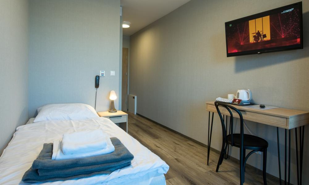 Pokoje są funkcjonalnie urządzone, wyposażone m.in w TV, czajnik, darmowe Wi-Fi.