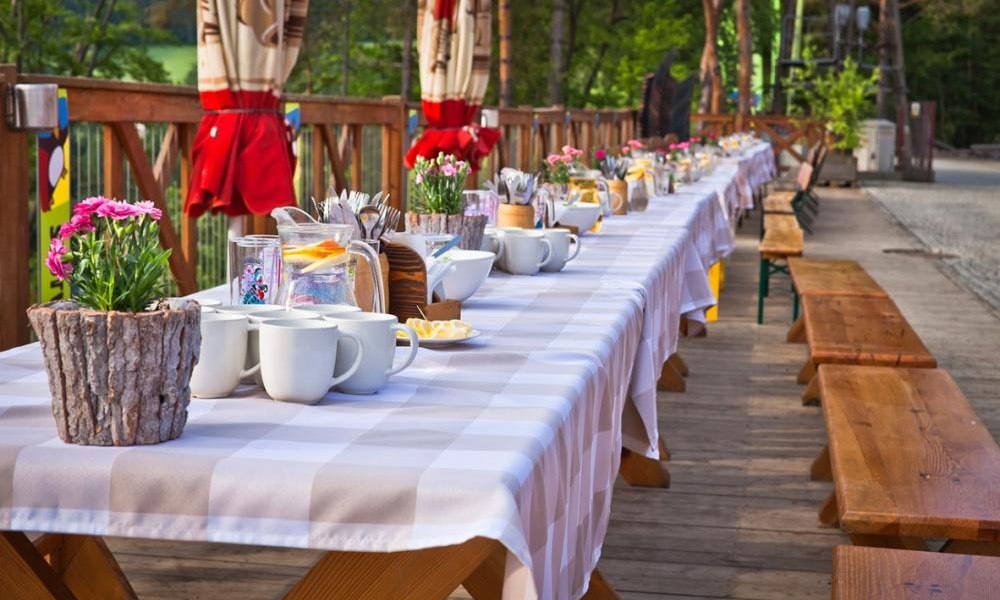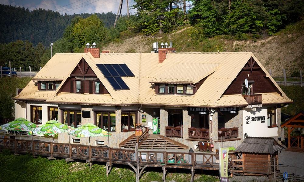 Restauracja „Widokowa” znajduje się tuż przy parkingu i dolnej stacji kolei linowej Słotwiny Arena. Z okien możemy podziwiać Wieżę widokową ze ścieżką w koronach drzew oraz stok narciarski.